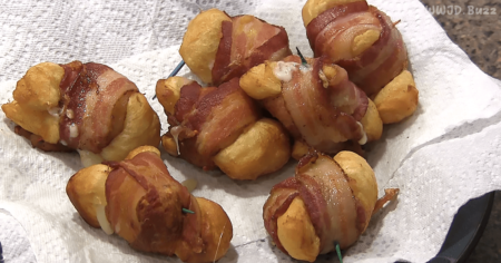 To make this easy “cheesy bacon bombs”, you need to purchase a can of Pillsbury biscuit dough, some mozzarella, and some thick-cut bacon. Cut the biscuit dough rounds in half and wrap them around a cube of cheese. Then wrap it with bacon. Use a toothpick to keep the bacon in place. Deep fry the whole thing and you are good to go.