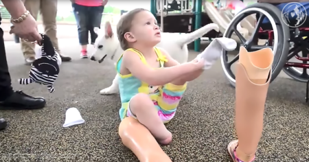 Little Sapphyre Johnson from Tennessee might be missing her feet, but that doesn’t stop her from sharing her love. She’s adopted a puppy missing its front paw, and the two are now adorably inseparable.