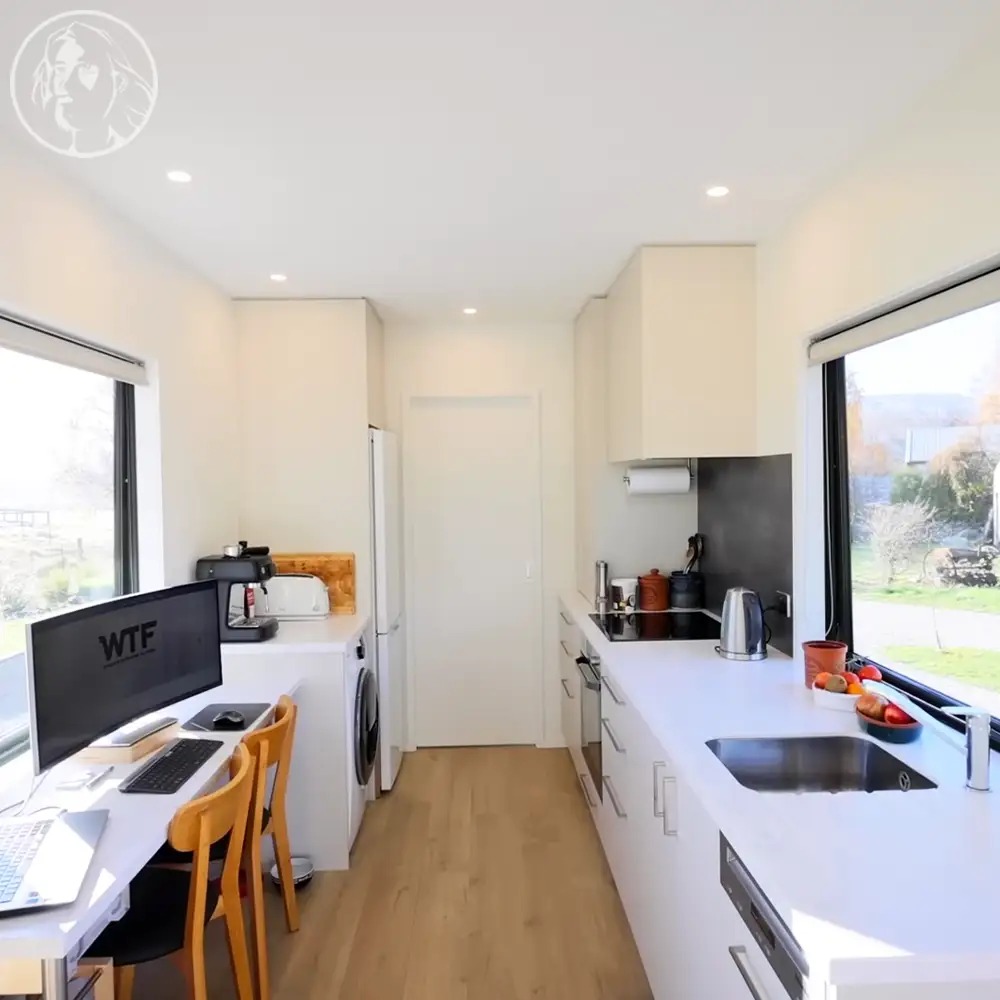 Throughout the house, the blend of simplicity and luxury is evident. The high-quality finishes, like the exquisite Korean bench tops in the kitchen, speak of a refined taste, while the built-in trivets and secret drawers suggest a practical side that understands the essence of tiny living. It’s not just about having less; it’s about making the most of every inch.