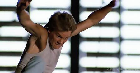 He begins to dance to “Never” by Moving Pictures. He hits the walls, jumps, swings from a rope, and seethes with anger until he’s exhausted.