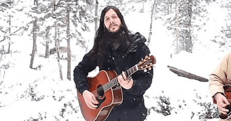 In the clip, the duo performs an unforgettable rendition of the A.A. Bondy song “American Hearts”. Their cover is perfect and the snowy background of the woods is perfect as well. Just a few seconds into the song, some wolves decide to drop in to hear them perform. Shawn and Baker continue on, and thus this unreal footage was captured on camera. This is a live recording in one take.
